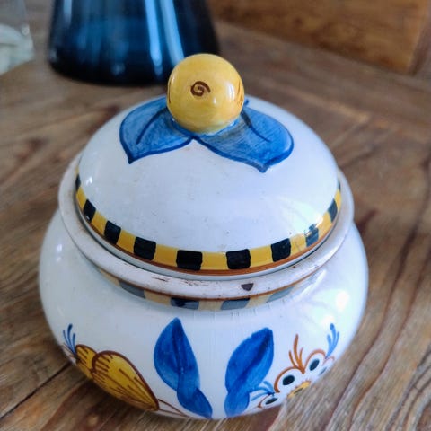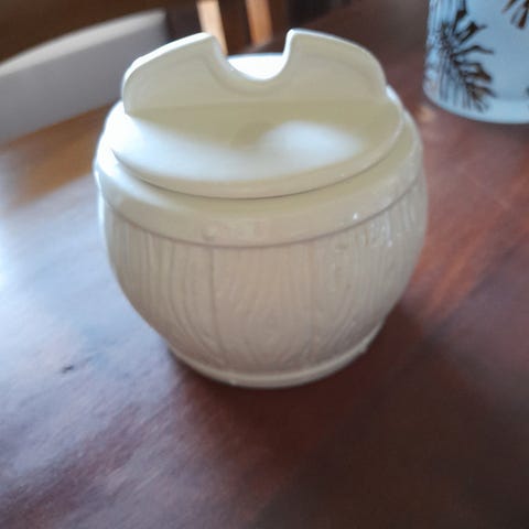 Nydelig gammel sukkerkopp med lokk selges. Koppen er 9,5 cm uten lokk og 9-11 cm i diameter. Pent brukt.
