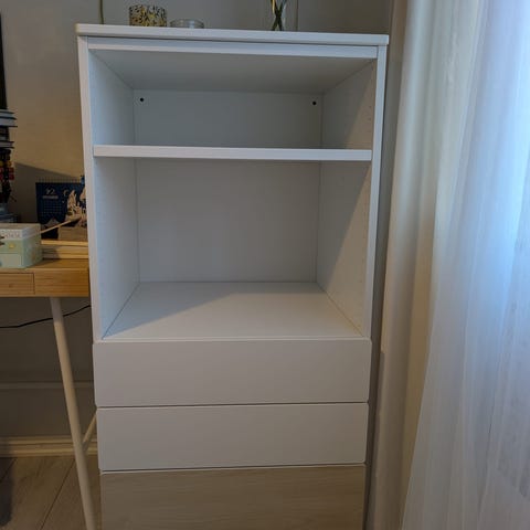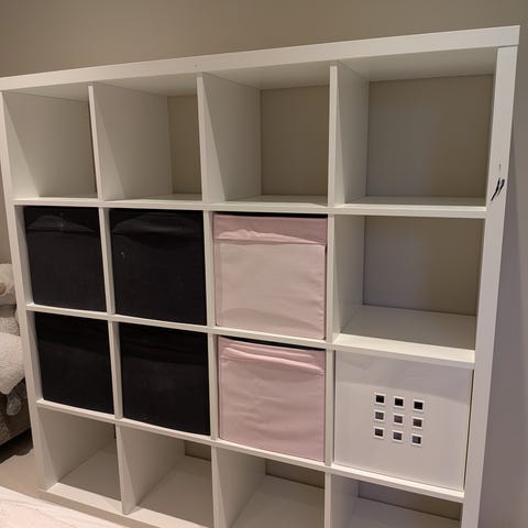 Selger en pent brukt Ikea kallax hylle med 2 bokser.