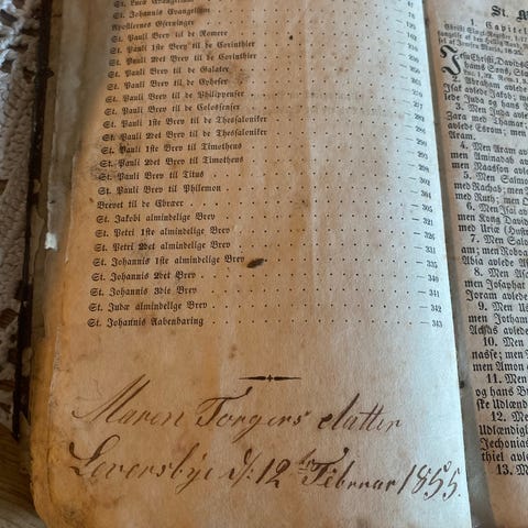 Den Hellige Skrift, Det Gamle og Nye Testamentes samlete bøker, utgave fra 1873 med svart lærinnbinding. Boken inneholder bibeltekster på dansk, med slitasje på omslaget og sider, og har en signatur fra 1878 på innsiden.