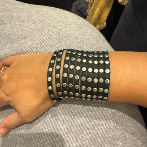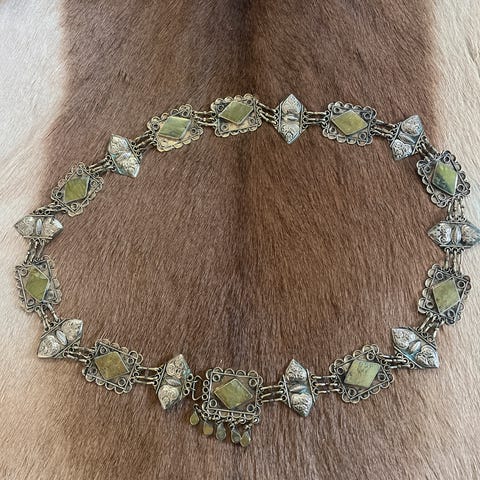 Pent halskjede i skinn/lær med langt smalt sølvanheng. Ukjent merke. Lengde ca 50 cm.