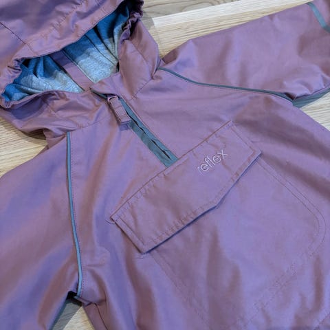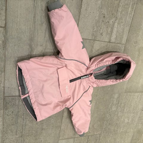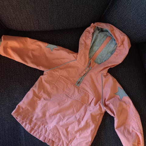 Rosa anorakk med åpning bak, som er genialt med de små når man skal kle av og på. Tynt og mykt fôr på innsiden.