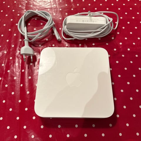 Apple AirPort Express i hvit farge. En nettverksruter med flere porter inkludert strømtilkobling, Ethernet-porter og USB-port. Designet for å distribuere trådløst nettverk i hjem eller kontor.