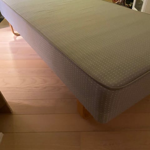 Ramme med ribber, beskyttelsestrekk, madrass og bein i bøk (20 cm). Se bilder for detaljer. Pute, dyne og sengetøy på bildet følger ikke med.