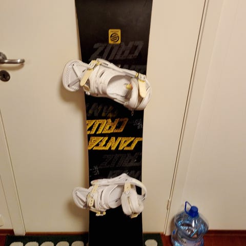 Klassisk Santa Cruz Screaming Hand snowboard (148 cm) selges med Flow bakinnstegs-bindinger.