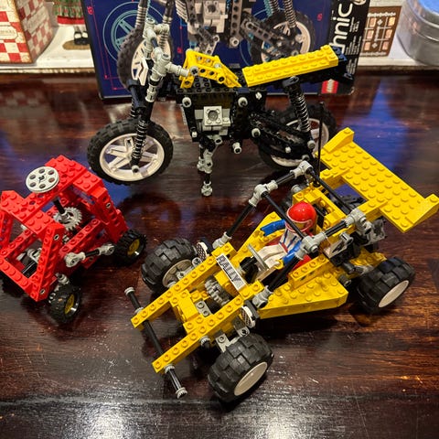 LEGO Technic byggeklosser med ulike deler inkludert hjul, plater, aksler og koblinger i flere farger som blå, rød, hvit og svart.