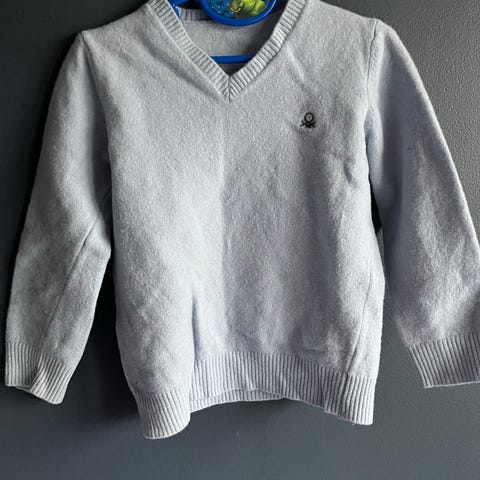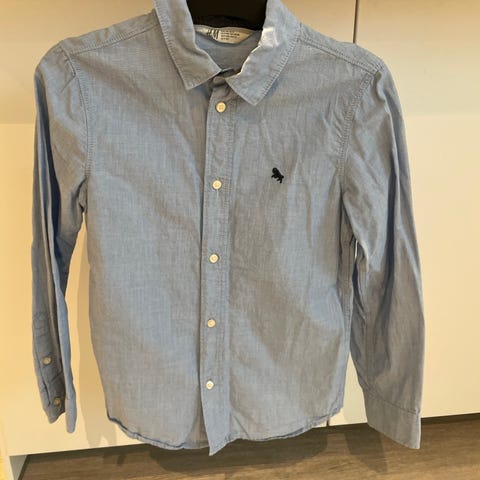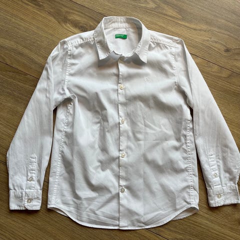 Lyseblå skjorte fra Benetton. Størrelseslappen er tatt bort, men har passa min sønn 7-8 års alder, som tilsvarer 128.