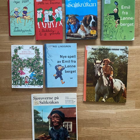 Astrid Lindgren barnebøker med titler som Brødrene Løvehjerte, Emil fra Lønneberget, Pippi Langstrømpe, Se, Marikken, det snør! og Marikken. Bøkene er illustrerte og passer for barn. Inneholder kjente historier av Astrid Lindgren.