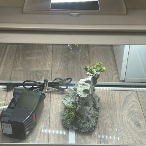 Med pumpe, noe filter, varmekolbe, hevert, håv, skrape, svamp/skrubb, bakgrunsark og sand.
