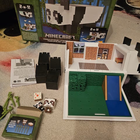 Minecraft leketøy med ulike våpen og figurer. Inneholder flere elementer som sverd, øks, og andre tilbehør inspirert av Minecraft-universet. Passer for barn som er interessert i Minecraft.