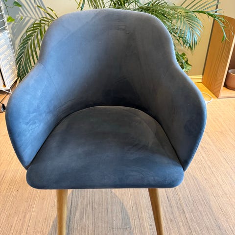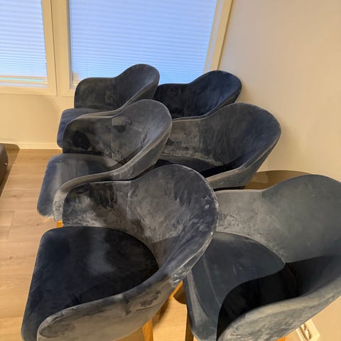 4 spisestoler fra SOFACOMPANY i velour matt steal grey og ben i smoked oak. Stolene har armlen og er veldig behagelige å sitte i.