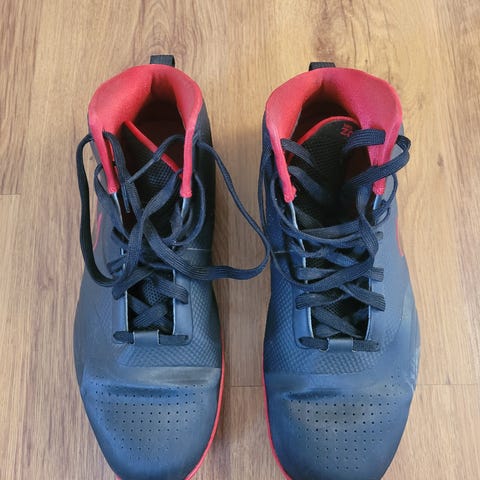 Nike basketballsko i størrelse 44. Skoene har svart og rød farge, designet for basketballbruk.