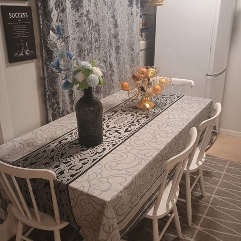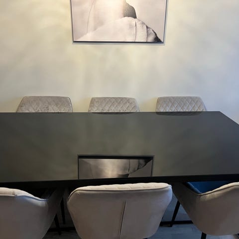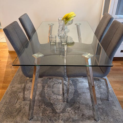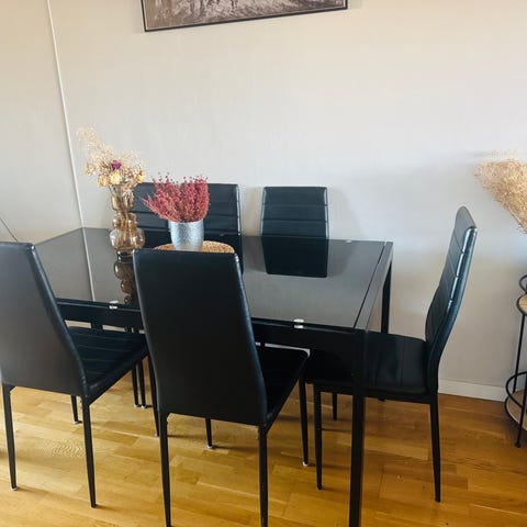 Spisebord med glassplate og 8 stoler
