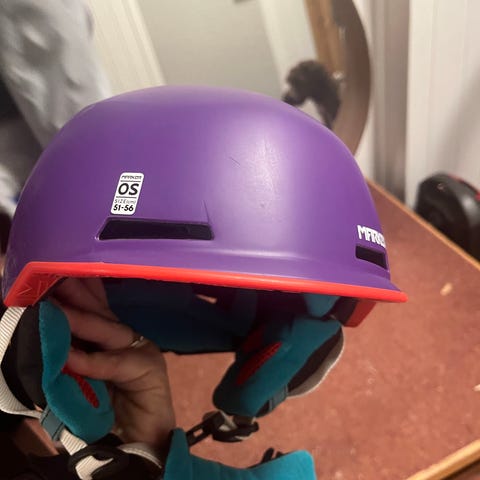 Vi har en slalomhjelm som ikke passer lenger. Størrelsen er skrapt bort, men en annen hjelm brukt i samme periode har innskrevet str 51,5-55,5 cm inngravert,så det er likt.