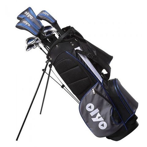 Golfbag med stativ og tilhørende golfkøller. Bagen har flere lommer for oppbevaring og stativ for enkel plassering på banen. Passer til unge golfspillere som trenger en bærebag med utstyr.