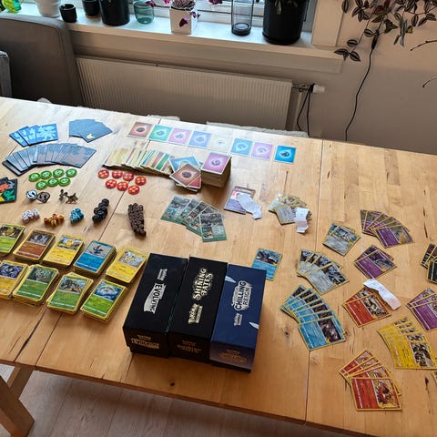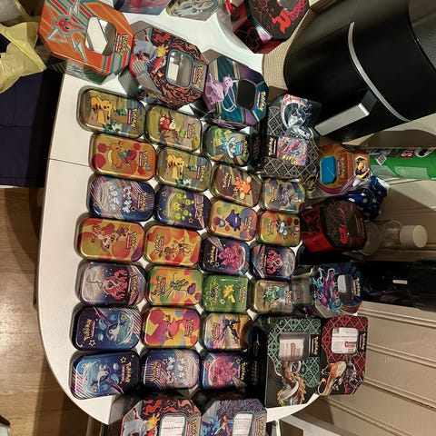 Pokémon Trading Card Game metallboks med ca 200 kort. Alle kort er ekte, kjøpt i butikk gjennom tiden 2022-2025.