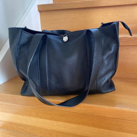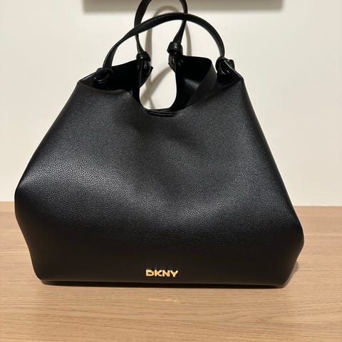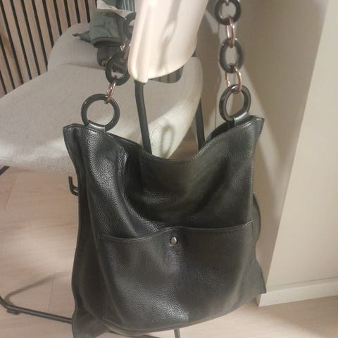 Original Coach-veske i mykt, sort skinn. Klassisk skuldermodell med justerbar stropp. Lys og gylden, og tydelig logo/creed på innsiden som bekrefter ekthet. Ingen bruksmerker, fremstår som ny. Romslig med flere lommer.