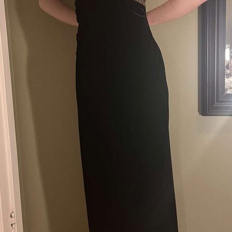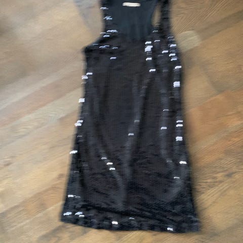 Veldig fin festkjole i størrelse S, farge gull. Laget av paljetter. Kjolen har lange ermer og er designet for kvinner. Var brukt kun 1 gang