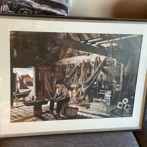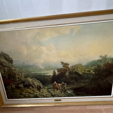 Motivet er 37x37 cm, men er innrammet og måler da 55x58 cm.