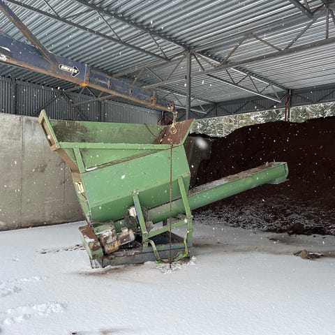 Ukjent merke silo med metallramme. Strukturen er laget av metall og er malt blå. Siloen er designet for lagring og utlevering av løse materialer. Den står på fire ben og har en traktformet bunn for enkel tømming.