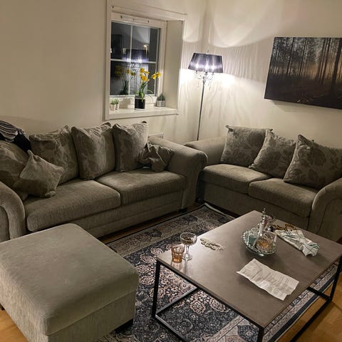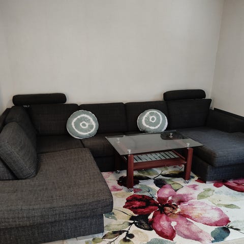 Fargen er lys beige, og består av flere moduler satt sammen til en U-form, med god plass til mange personer. Må renses
