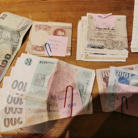 Over 30 sedler + en boks full av mynter fra mange land. Minst 25 forskjellige valutaer representert, inkludert Tyrkia (gamle lira), Sverige, Singapore, India, Qatar, Egypt, Nigeria, Libanon, Italia (gamle lira før euro) og flere fra Afrika, Asia og Midtøsten.