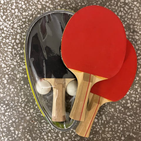 bordtennisrack med røde gummioverflater og trehåndtak. Settet inkluderer to racketer og fire hvite bordtennisballer.