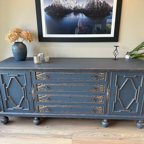 Unik og nyoppusset skjenk i dyp blå – Klassisk eleganse med luksuriøse detaljer