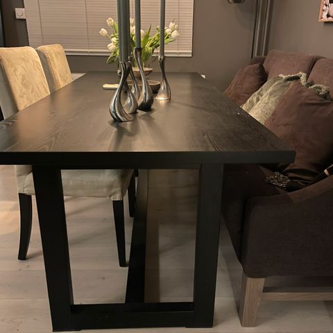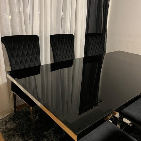 Selger en flott og moderne spisegruppe som består av et spisebord med betong-look plate og 6 komfortable sorte velurstoler. Kjøpt for under ett år siden og svært lite brukt.