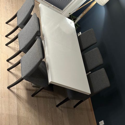 Både bord og stoler er helt uten riper, skader eller flekker – fremstår som nye.