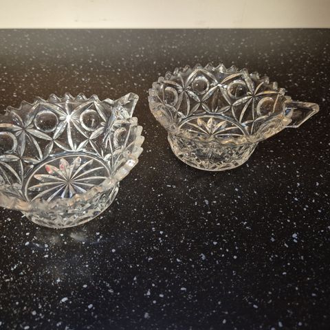 2x vintage glassskåler med geometrisk mønster, stemplet France på undersiden. Opprinnelig askebeger, men passer like fint som smykkefat, til ringer, nøkler eller småting. Tidløs og dekorativ. Se bilder for mål. Usikker på om de er i glass eller krystall. Selges samlet for kr 250,-. ✨