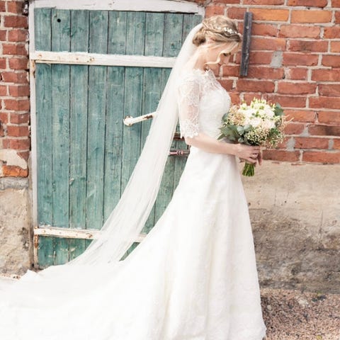Den har hengt på lager i over 10 år, og tenker at noen andre bør kunne ta den over til sitt bryllup. Det er en utrolig vakker kjole. Har også et brudeslør.