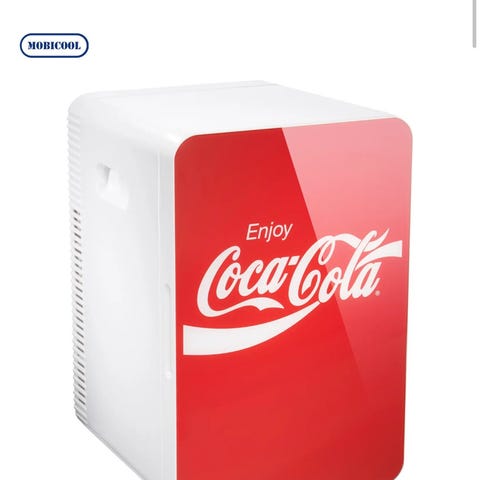 Dette er en Mobicool MT48W termoelektrisk kjøleboks med Coca-Cola-merkevare.