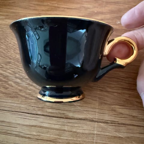 Flott Espresso kopp med skål i bått med gullkant fra Figgjo. Noen av de mer sjeldne å se for salg.