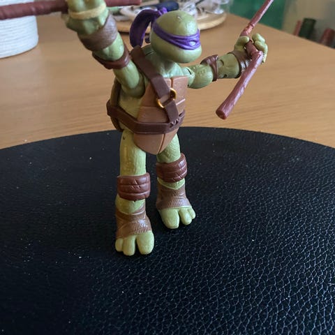 Teenage Mutant Ninja Turtles Mikey figur som kan skyte pizzaer ved å rulle på hjulene onder føttene. Selges fordi det ikke blir brukt lengre.