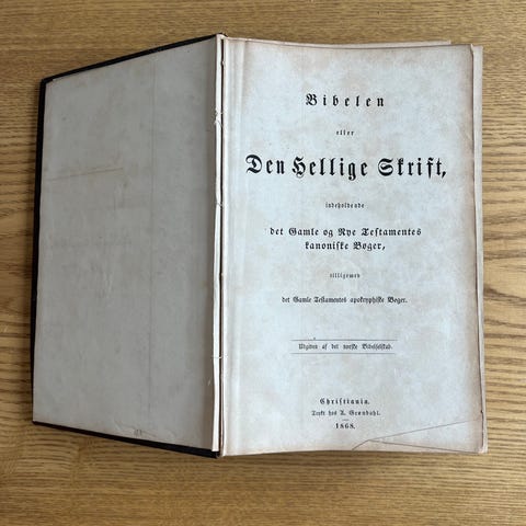 Bibelen Den hellige Skrift bok med fargede illustrasjoner. Utgitt av Det Norske Bibelselskap i 1919. Inskripsjon på utsiden og tekst på en side foran i boken