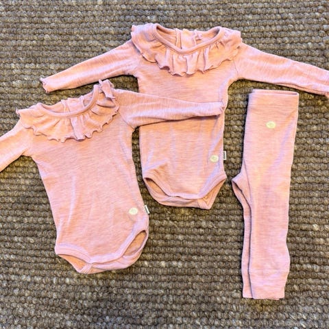 Lillelam heldrakt og lue i merinoull for jente i størrelse 56, farget lilla. Laget av myk og varm merinoull, egnet for barn i denne alderen.