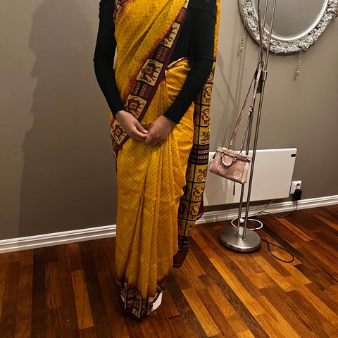 Selger en nydelig tradisjonell saree i georgette silk i varm brun/terracotta-tone med blomstrete mønster og dekorativ gullkant. Stoffet er lett, luftig og faller svært pent, noe som gjør den komfortabel å bruke.