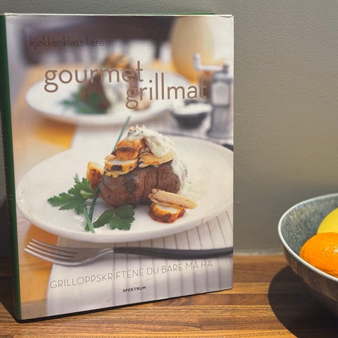 Gourmet Grillmat kokebok med oppskrifter for grilling. Inneholder ulike grillretter med fokus på smak og tilberedning.