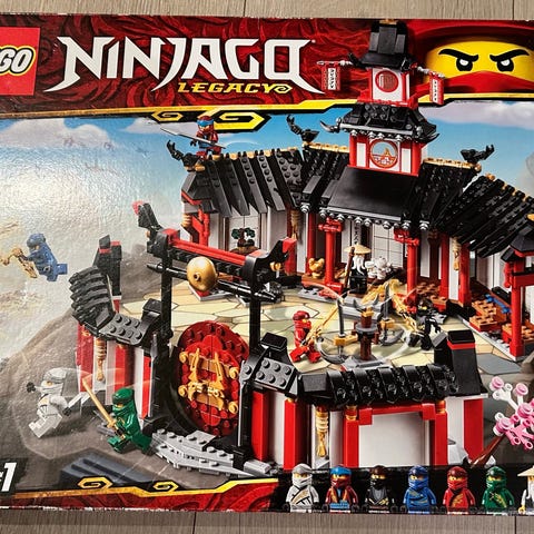 LEGO NINJAGO Legacy tempelbyggesett med flere minifigurer. Settet inkluderer en detaljert tempelbygning med rød og svart fargekombinasjon, og flere tilbehør som våpen og flagg. Passer for bygging og samling innen LEGO NINJAGO-serien.
