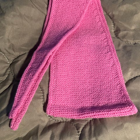 Rosa strikket skjerf med grønne striper som en artig variant. Har strikket kun én i denne varianten. Skjerfet er kort så det passer f.eks. godt som tilbehør til skjorte😉