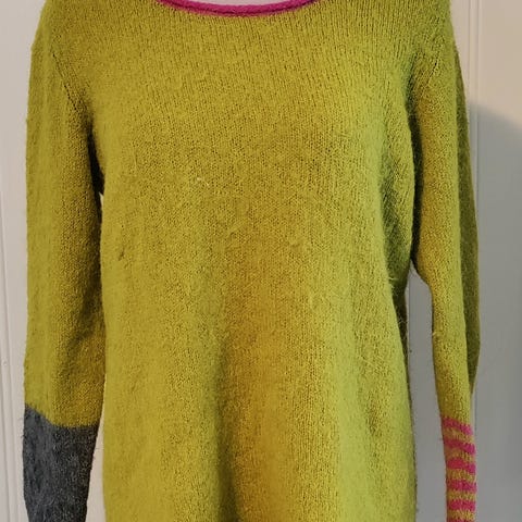 Genseren har vært sjelden i bruk. Den ser ut som ny og er vakker. Lengden er 58-59 cm, og brystbredden er 49 cm. Den er 100 % ull.
