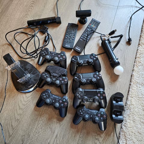 Playstation 3 spillkonsoll med flere trådløse kontroller. Konsollen har et svart design og støtter et bredt utvalg av spill for hjemmeunderholdning.