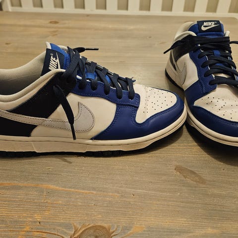Selger Nike Dunk Low i størrelse 44,5. De er brukt svært lite og er i tilstand som nye. Skoene har nesten alltid ligget i esken, derfor selger jeg dem fordi jeg ikke har behov for dem. For alle spørsmål kan dere skrive til meg i private meldinger.