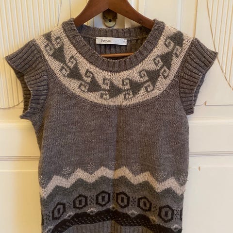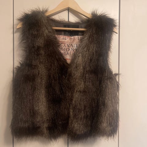Vesten har vært sjelden brukt, kanskje et par ganger. Den ser ut som ny. Lengden er 66 cm foran og 73 cm bak. Brystbredden er 55 cm. Den er laget av en blanding av alpakka, acryl, nylon og ull.