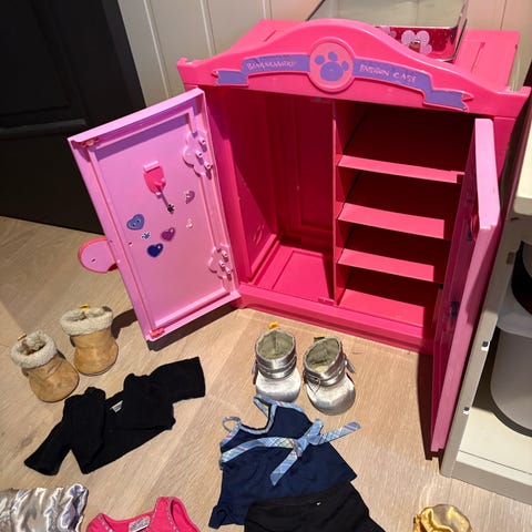 Klær og tilbehør bestående av veske, sko, fiskedress, vinterdress, pels, julenissebukse og blå kjole. Kan kjøpes samlet og separat