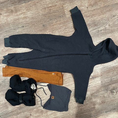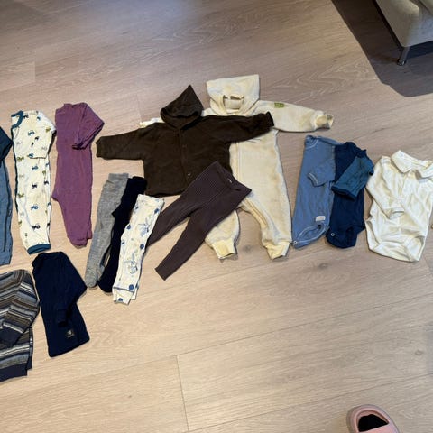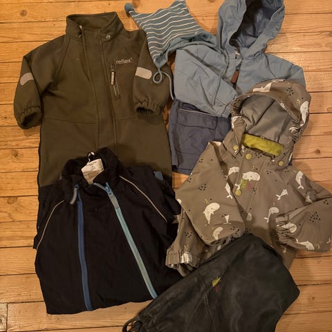 - Ett ullsett, fleecejakke, ellers bomull + regnvotter fra Kattnakken str 0-1år