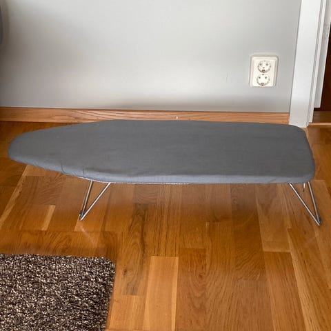 Strykebrett med grått trekk med hvite blomster, justerbare ben og tilbehør for strykejern. Passer til bruk i hjemmet for effektiv stryking av klær.