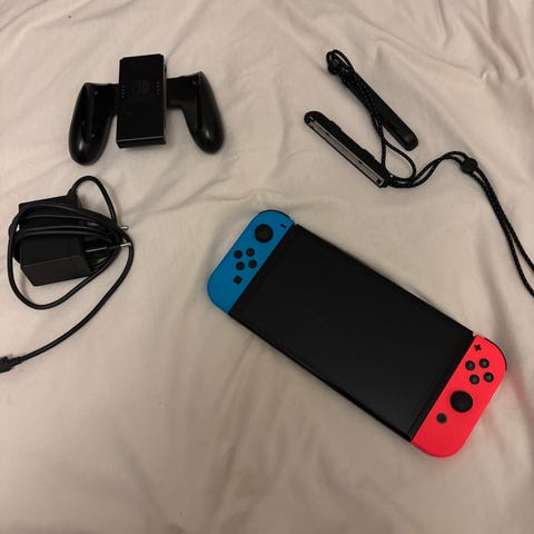 Nintendo Switch spillkonsoll med blå og rød Joy-Con kontroller. Inkluderer hovedenhet, to Joy-Con kontroller, og ladekabel. Bærbar spillkonsoll med berøringsskjerm og mulighet for tilkobling til TV. Passer for spillere i alle aldre.