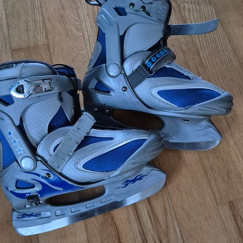 Barn skøyter for ishockey med justerbar størrelse, 30-33. Skøytene har blå og svarte detaljer og er laget for barn. Brukt 2 ganger.