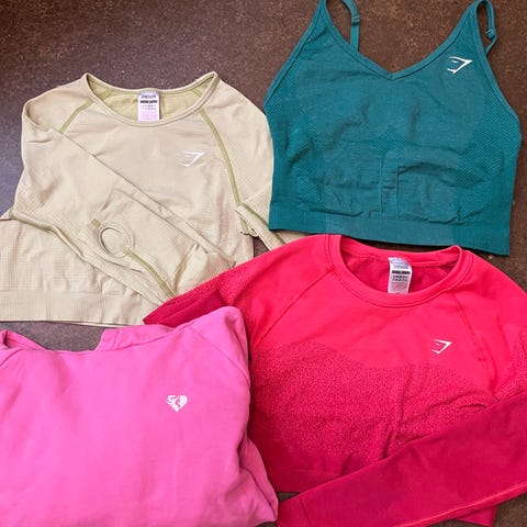 Masse plagg fra eldre kolleksjoner fra Gymshark selges til en billig penge. Nesten alt er i størrelse S og M (utenom mørk blå hettegenser, den er i L). Noen av klærne har fortsatt lappene på. Alt er pent brukt eller helt nytt. Hvert plagg selges til mellom 175-200kr!